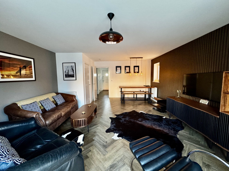 Finished to a superb standard throughout, the property features a welcoming hallway with herringbone Amtico flooring, a sleek gloss-finish kitchen with integrated appliances, a ground floor WC, and a spacious open-plan lounge/dining area with French doors opening onto a beautifully landscaped, low-maintenance garden.